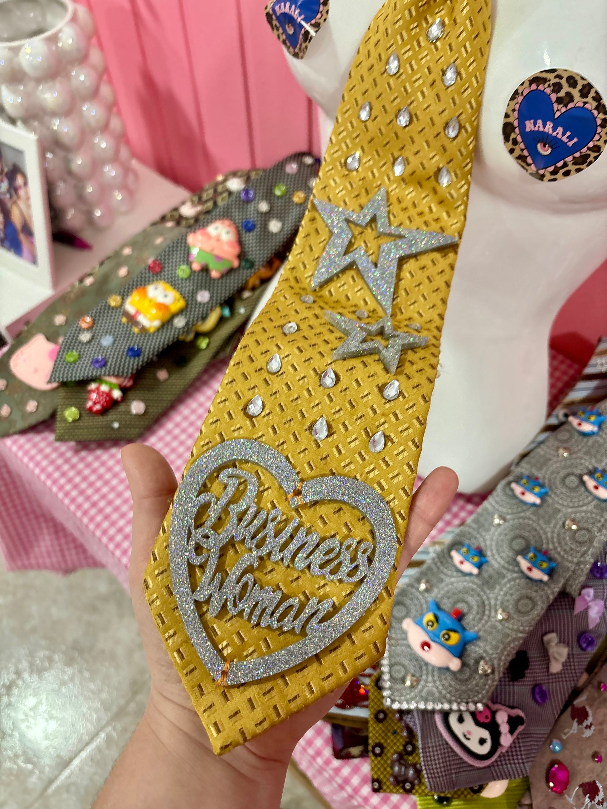 Esta corbata es una pieza vintage o de segunda mano que rescato, limpio y transformo desde cero. Las intervengo con accesorios, pintura, lazos, costuras visibles, charms, cadenas o brillos, según lo que la propia prenda inspire.
